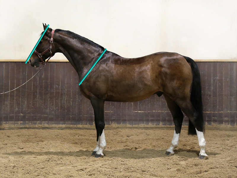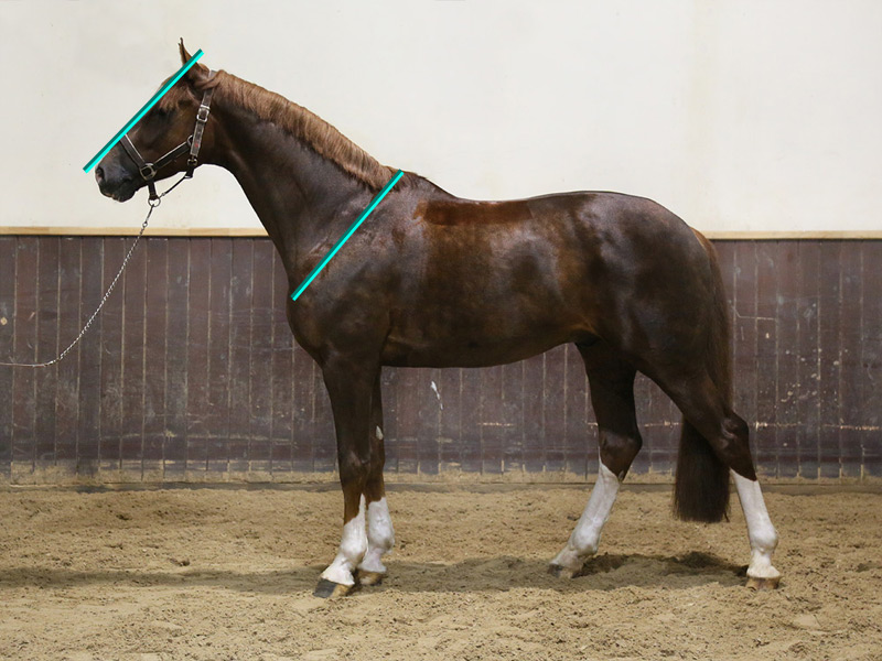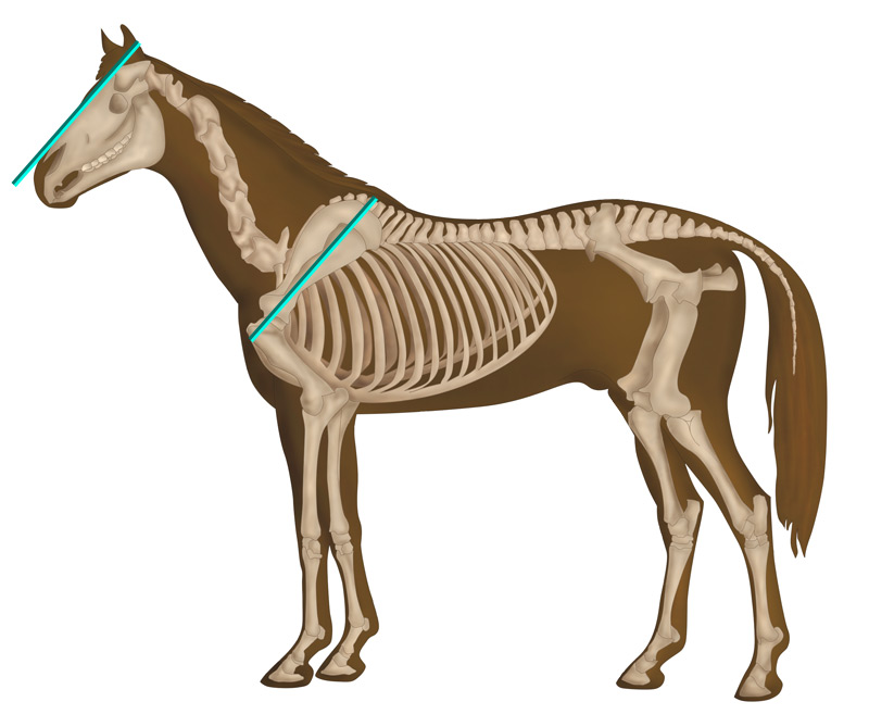 Otóż: linia, którą możemy poprowadzić po kości czołowej i kości nosowej konia (czyli po końskim łbie z profilu) powinna być równoległa do linii łopatki.